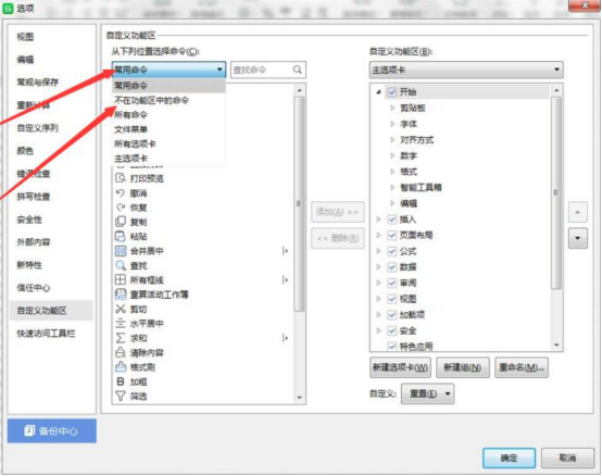 3.在自定义功能区的常用命令中,点击“不在功能区中的命令”这一项命令。