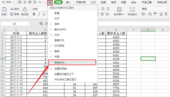 1.首先,在excel中将源表格数据编辑完成后,点击excel顶部菜单中前面的“自定义快速访问工具栏”按钮,在弹出的下拉菜单中点击“其他命令”。