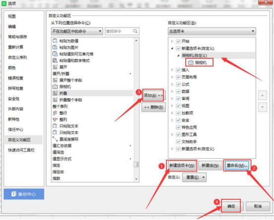 4.接下来,为了在excel中克隆表格。我们需要点击右侧自定义功能区下方的“新建选项卡”按钮,并根据需要对excel克隆后的表格进行重命名。之后,点击该窗口中部的“添加”按钮,再从右侧的新建选项卡(自定义)点击“照相机”,并点击“确定”按钮。