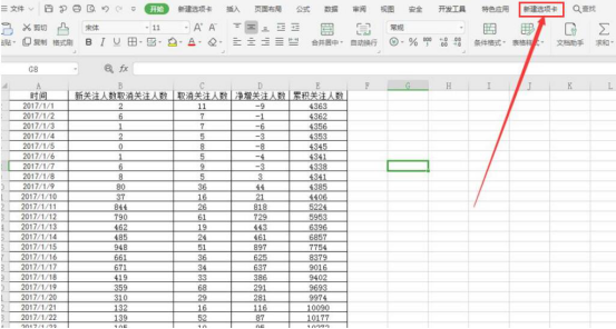 5.回到excel操作界面,在顶部菜单栏中点击“新建选项卡”。
