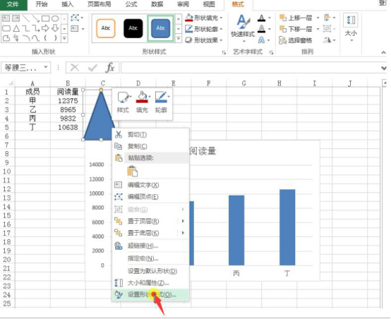 3.在excel空白处按住鼠标左键画出一个三角形。画好后,根据自己的需要调整三角形,并右键单击该三角形,在右键菜单中点击“设置形状格式”。