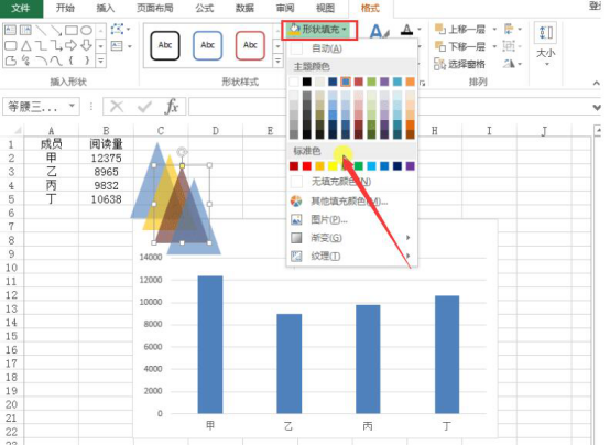 6.双击每个三角形,通过excel“格式”菜单中的“形状填充”,为三角形分别填充颜色。
