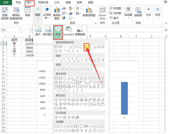 2.然后,我们开始对excel图表开始自定义美化。点击excel“插入”菜单中的“形状”,从形状列表中点击想要的形状,例如选择三角形。