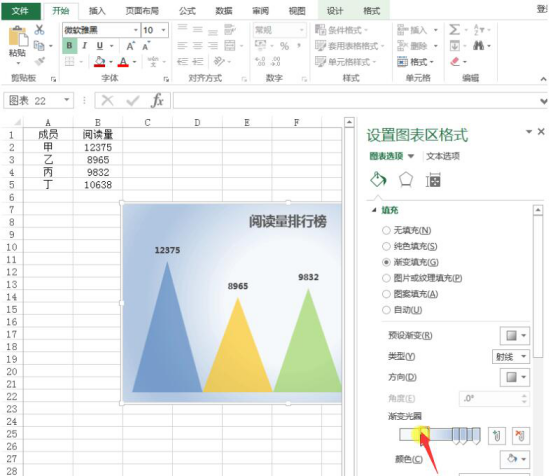 12.右键单击整个excel图表,调出设置图表区格式的界面。点选“渐变填充”,调整预设渐变、类型、方向,还可以调整渐变光圈。
