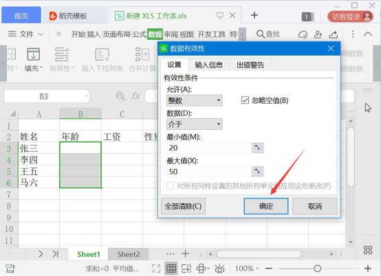 3.此时,excel便会弹出数据有效性的窗口。在此窗口中,设置有效性条件的允许为“整数”,数据选择“介于”,设定最小值为20,最大值为50,再点击“确定”按钮。