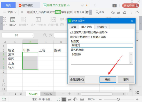 7.在excel数据有效性窗口中,除了可以设置限制条件和输入提示,还可以切换至“出错警告”选项卡,选择警告的样式,输入标题、错误信息的提醒,点击“确定”按钮。