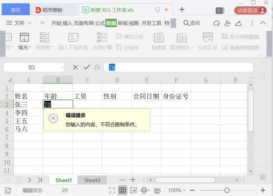 4.回到excel的表格,在刚才设定了数据有效性的单元格中输入70,发现excel会自动弹出如下图的错误提示。提醒我们输入的内容不符合限制条件。
