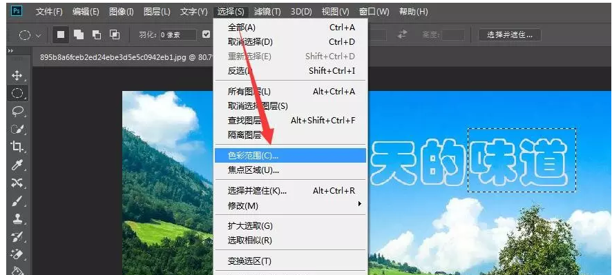 在菜单栏中点击【选择】——【色彩范围】,框选文字区域,