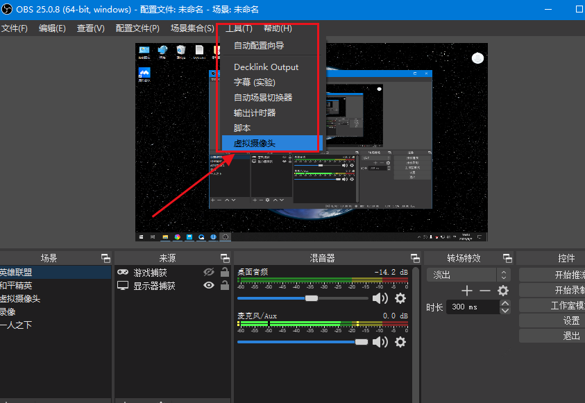 一切准备就绪,使用管理员身份运行OBS软件,打开软件,在上方菜单栏中点击【工具】——【虚拟摄像头】选项,