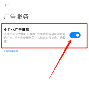如图,点击【个性化广告推荐】,将该服务关闭,此时你仍会收到同等数量的广告,但是不会使用你的个人信息进行定向广告投放。