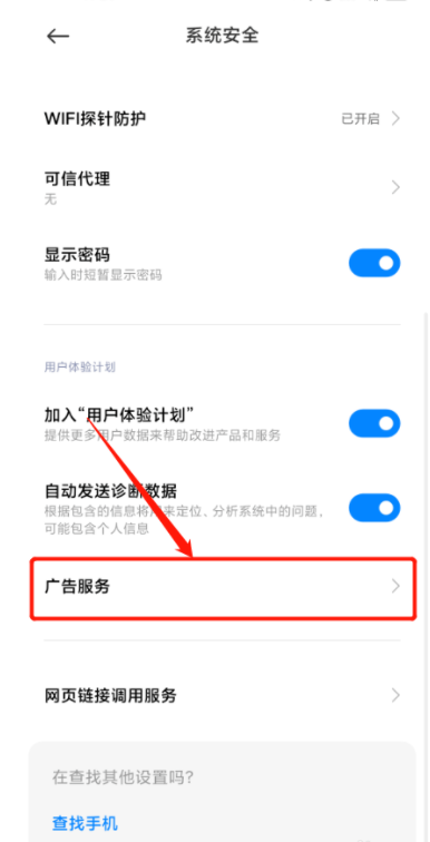 进入系统安全服务窗口,点击下方【广告服务】,