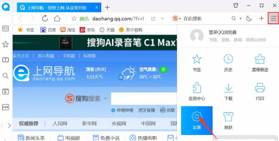 1.首先,用户打开QQ浏览器,点击界面右上方的“≡”,在它弹出来的菜单中点击“设置”。