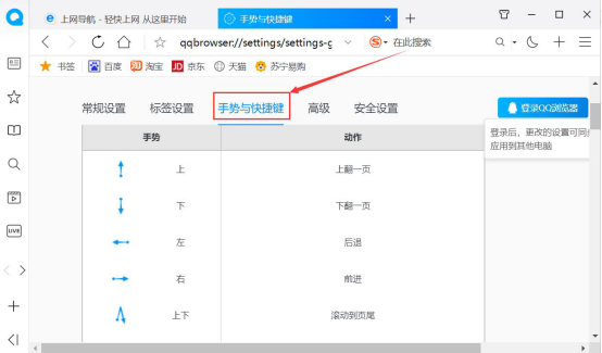 2.然后,进入QQ浏览器的设置页面,再切换至“手势与快捷键”的选项卡页面。