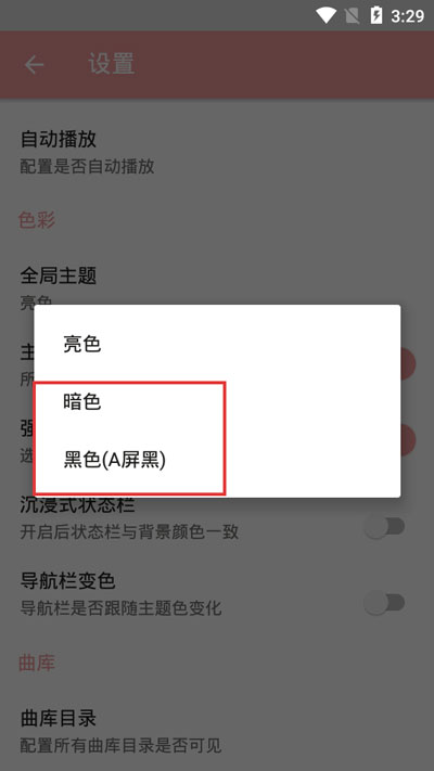 4、然后选择【暗色】或者【黑色(A屏黑)】,这两种模式都可以进入深色模式,但是两种主题还是有点不同的;