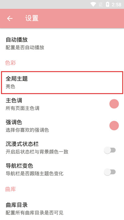 3、在设置中,下滑找到色彩下方的【全局主题】,点击;