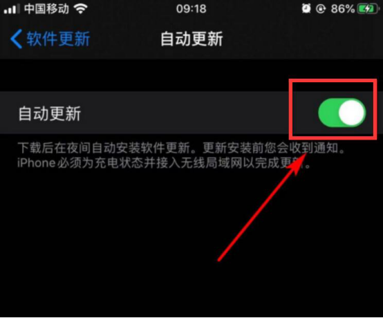 4.接下来,在iPhone“软件更新”页面中找到“自动更新”功能,可以看到它默认是打开的,点击它继续下一步操作。