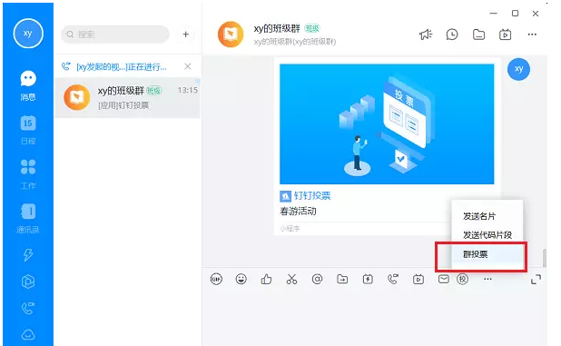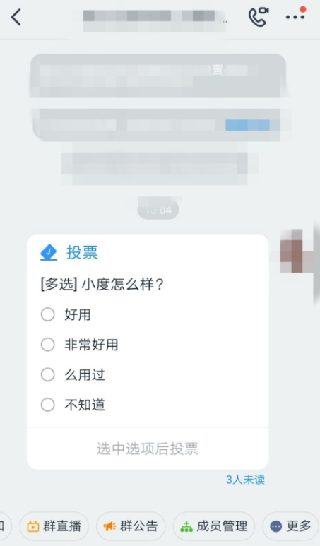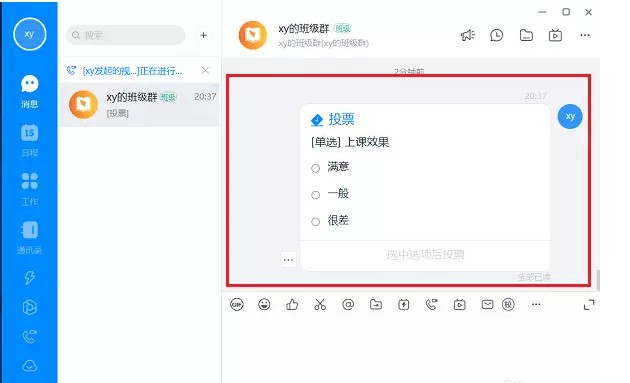 返回群聊窗口,如图,你可以看到刚才创建的投票,所有群成员都能参与进行投票。