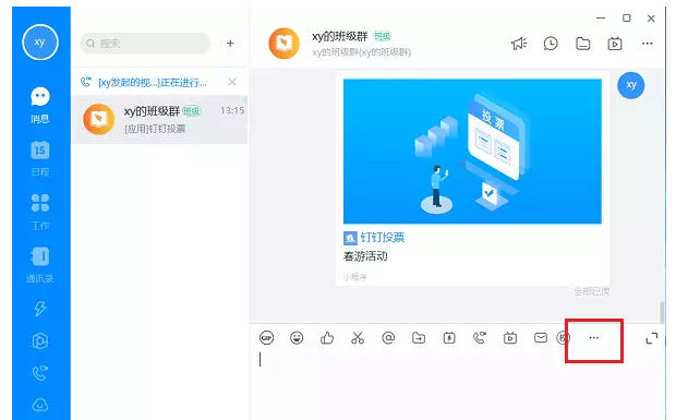 在电脑上打开钉钉,登录软件,进入界面,如图,选择一个群聊,点击三点图标,展开选项,点击【群投票】功能,