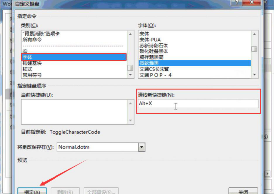 4.接下来,在自定义键盘窗口中,选择“字体”类别,并选择自己常用的字体,例如,这里选择微软雅黑。并在“请按新快捷键”中设置自己想要的快捷键,例如设置为“Alt+X”,再点击“指定”按钮。