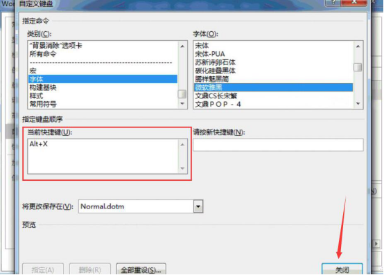 5.word常用字体快捷键设置了之后,在自定义键盘窗口中的“当前快捷键”的编辑框中便会生成我们所设置的该字体快捷键,点击“关闭”按钮。