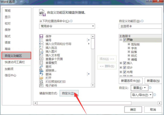 3.进入word选项页面后,先点击左侧菜单栏中的“自定义功能区”,并在右侧的界面中点击“自定义”按钮。