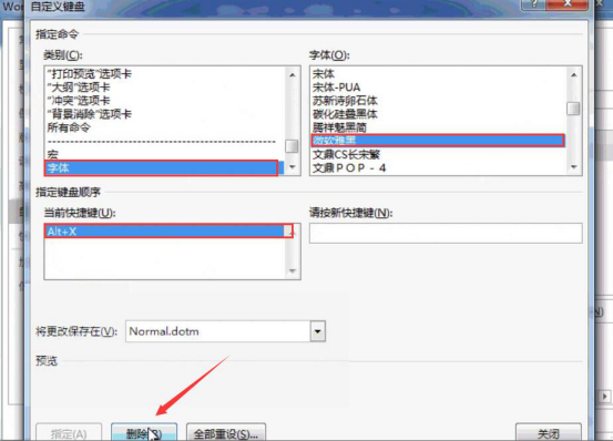 9.当然了,如果自己设置的word常用字体快捷键不想用了,就可以回到自定义键盘窗口,将该字体的当前快键键选中,点击“删除”按钮即可。