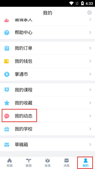 4、如果需要取消对个人用户的请关注,也就是一些家长、老师的账号请关注,进入【我也】页面,点击【我的动态】;