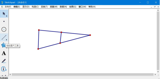 1.在几何画板中,点击左侧工具栏中的“线段直尺工具”,并在右侧绘图区画出一个简单的三角形,并在三角形中增加一条直线。便可以得到一个大三角形和一个小三角形重叠。
