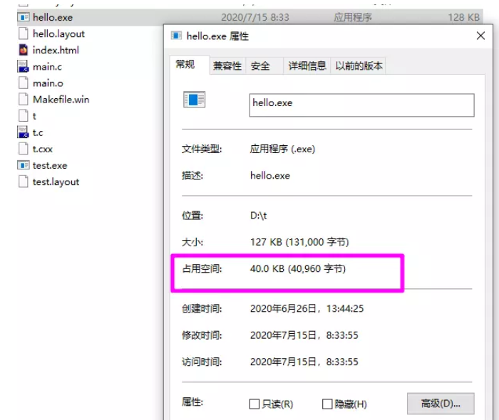 执行完成,返回查看hello.exe占用的磁盘空间,已经变成了40KB,
