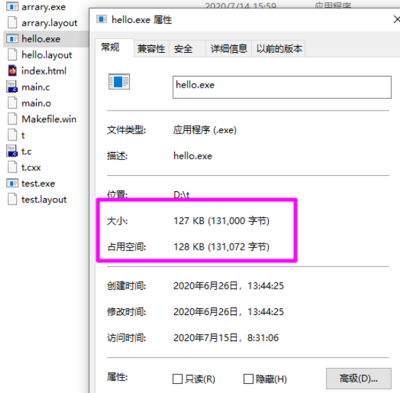 这里以d:\\t\\hello.exe为例,如图,hello.exe所占的磁盘空间为128Kb,