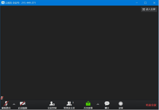 4.此时,进入云视讯电脑版的会议室。我们可以通过“会议控制”来一键邀请参会者,通过“管理参会者”设置全体静音;通过“共享屏幕”来分享屏幕内容等等;通过“聊天”发送信息;也可以通过“录制”来录制会议内容;而点击“结束会议”便可结束会议。