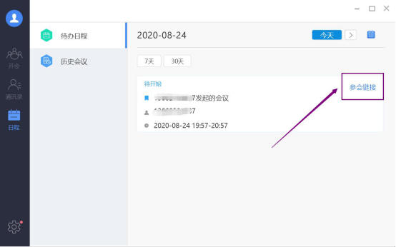 6.此时,云视讯电脑版便会自动跳转到待办日程页面,可以看到预约的这个会议主题、主持人、会议开始时间。点击“参会链接”。