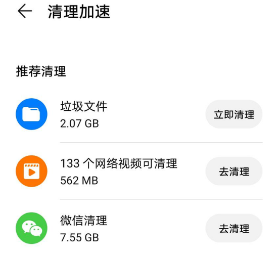 4.此时,手机便会展示出推荐清理的内容项,我们可以将它们都清理掉,这样华为手机助手在恢复备份数据的时候,就有足够的空间了。