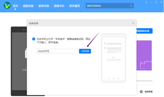1.将电脑端的华为手机助手打开,并将华为手机连接到电脑,将手机端的华为手机助手的连接验证码输入到电脑端的连接设备的文本框中,并点击“立即连接”按钮。