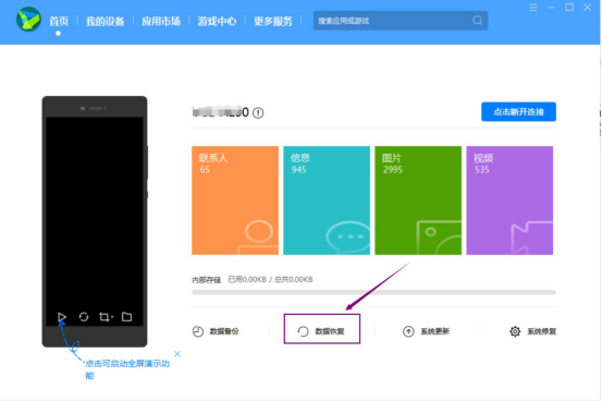 2.连接成功后,点击华为手机助手的“数据恢复”。它默认的是全部一起恢复,这里,我们选择自己想要恢复的备份数据,而且一次性不要恢复太多,点击“开始恢复”按钮,直至数据都恢复。
