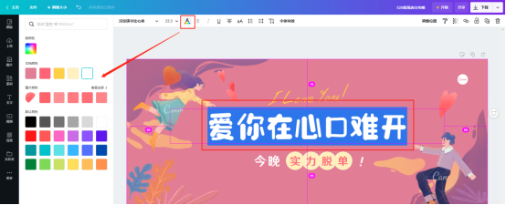 6、模板导入后,点击模板中的文字或模块进行编辑,比如将“520最强表白攻略”更改为“爱你在心口难开”,然后点击上方功能栏修改文字的字体、颜色等项目。