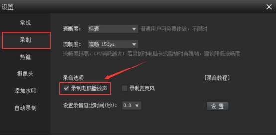 2.然后,切换至“录制”的设置页面,勾选“录制电脑播放声”。一般来说,这样设置后,kk录像机便可以连同电脑声音一起录制了。