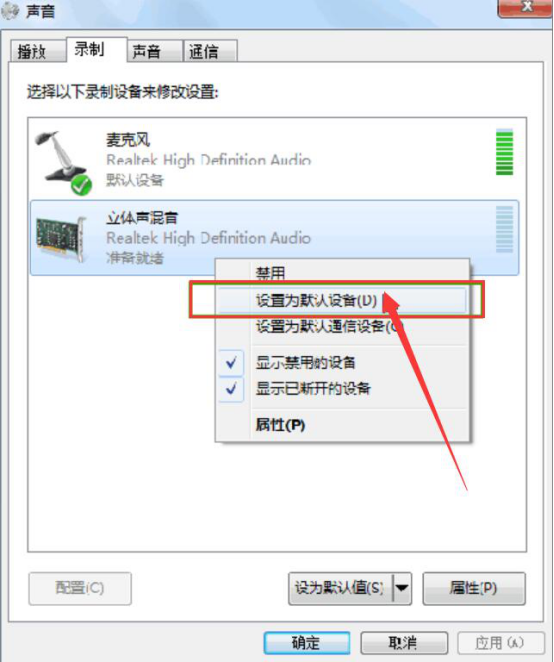 8.最后,鼠标右键再次单击“立体声混音”,在右键菜单中点击“设置为默认设备”,再次尝试使用kk录像机来录像,会发现电脑声音也能一并录制了。