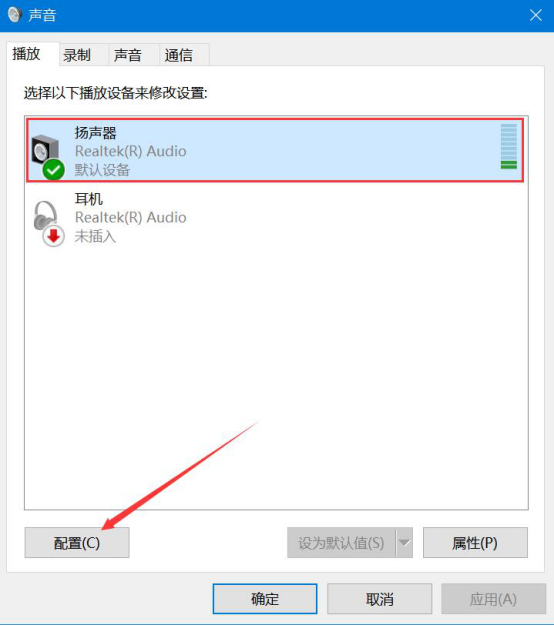 4.如果kk录像录制的电脑声音还是听不到,那就在“声音”窗口中,选中扬声器,点击“配置”按钮。