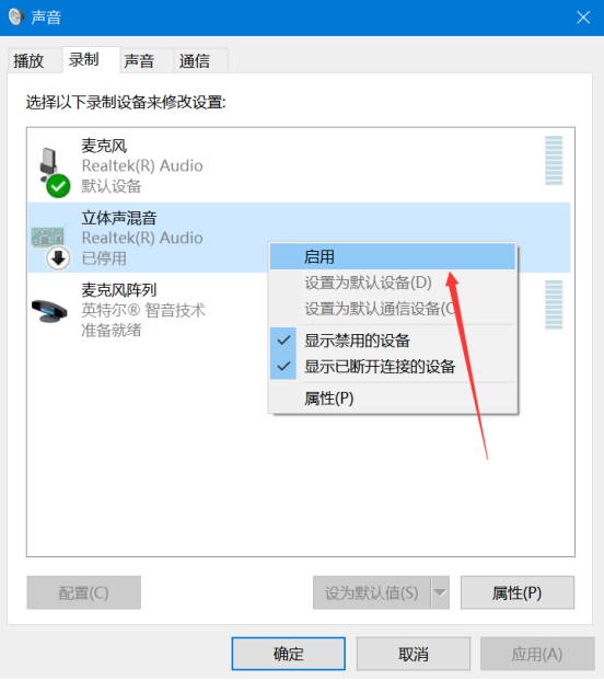 7.接下来,回到电脑声音的设置窗口,切换至“录制”选项卡,右键单击“立体声混音”并在右键菜单中点击“启用”。