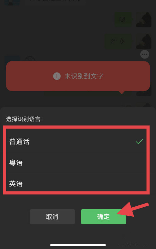 底部会弹出菜单选项,如图,选择识别语言,这里有普通话、粤语、英语三个选项,选好之后,点击确定,