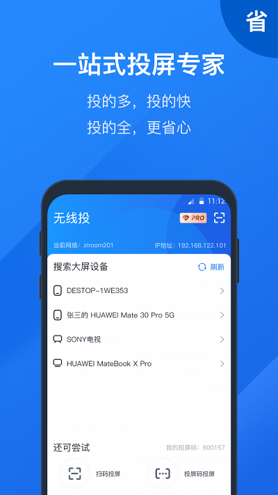 1、自动搜索投屏:设备接入到同一个WIFI网络环境下,自动搜索设备,即可成功连接。