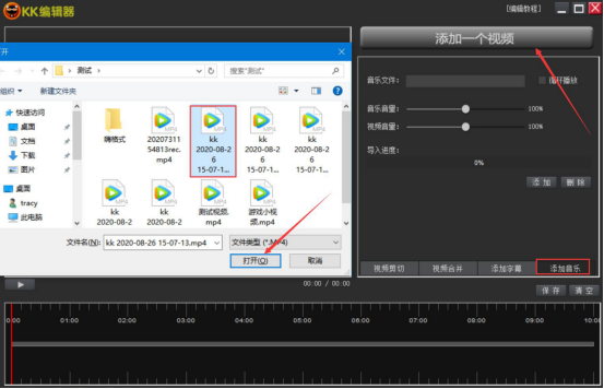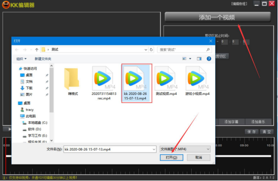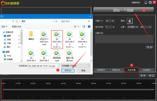 2.在kk编辑器中切换至“添加字幕”页面,点击“添加一个视频”按钮,在弹窗中选中需要添加字幕的视频,点击“打开”按钮。