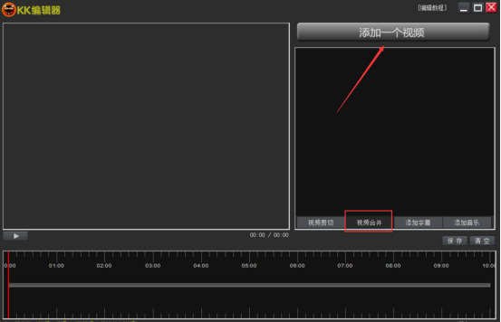 2.进入kk编辑器,切换至“视频合并”页面,点击“添加一个视频”按钮。