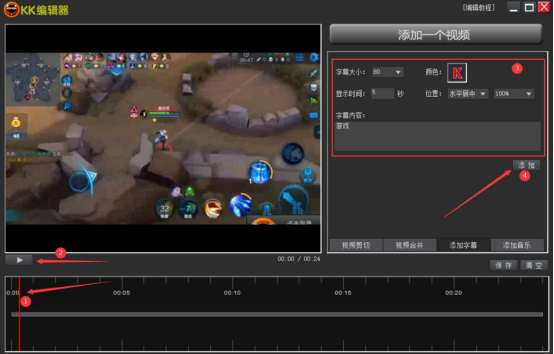 3.接下来,将指针定位到需要添加字幕的位置,输入字幕内容,设置字幕的大小、颜色、显示时间、位置,再点击“添加”按钮。