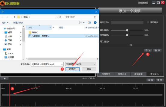3.再将指针定位到需要添加音乐的位置,点击“添加”按钮,在弹窗中,选中需要添加的音乐,点击“打开”按钮。