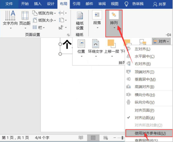 1.首先,和大家讲解如何使用参考线来实现word排版对齐。点击word“布局”菜单中的“排列”,从其下拉菜单中点击“使用对齐参考线”。