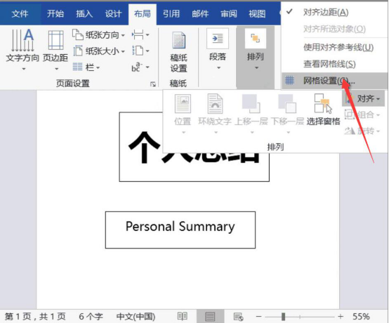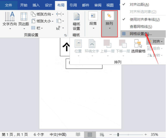 6.接下来,继续和大家讲解在word中如何自动排版对齐。点击“布局”菜单中的“排列”,并从其下拉菜单中点击“网格设置”。