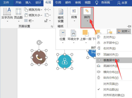 5.当然了,除了可以竖向对齐排版,也可以横向对齐排版。同理,先选中需要处理的图片,再在“排列”的下拉菜单中点击“垂直居中”。