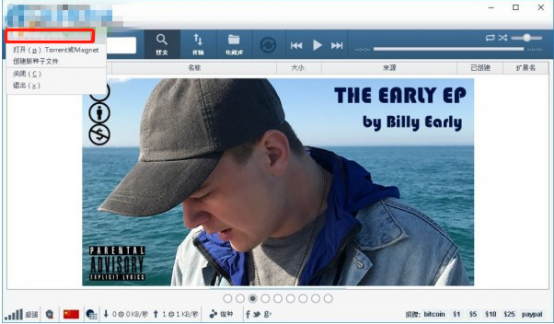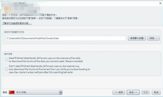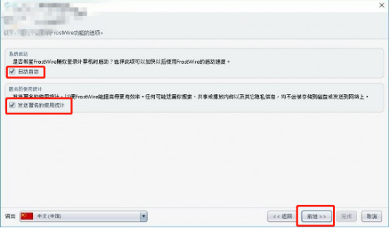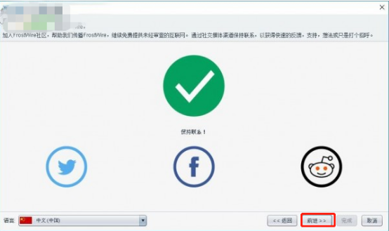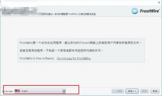 1、点击打开FrostWire,进入软件向导界面,点击左下角语言下拉框,选择【简体中文】,然后点击【前进】